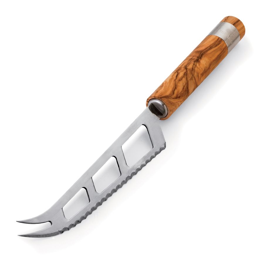 Hochwertiges Käsemesser der "Acero" Collection, mit gezackter Klinge und formschönem Griff aus Olivenholz mit Edelstahlband.