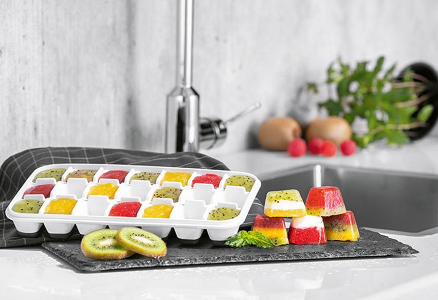Polypropylen / Gummi (TPR), je für 21 Eiswürfel, Eiswürfelgröße: (LxBxH): 4x2,5x3 cm·weiß / grau LxBxH): 25x15x4 cm