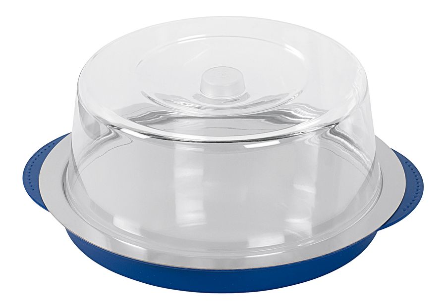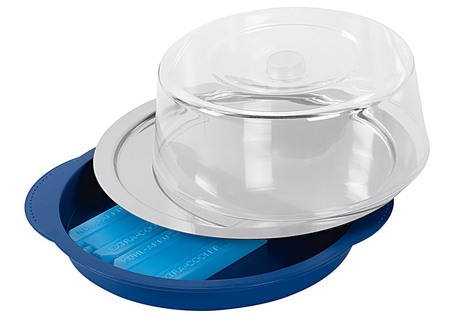 Edelstahl rostfrei / Kunststoff, mit Haube, mit 2 Langzeit-Kühlakkus, Trägerschale aus Polystyrol·blau / silber / transparent Ø 35 cm, H 15 cm·