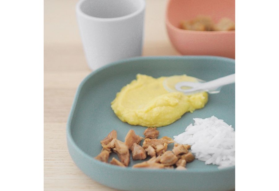 Silikon, Inhalt: 1 Teller, 1 Schüssel mit Saugnapf, 1 Becher, 1 Lernlöffel (2. Altersstufe), Design und Form sollen das Essen erleichtern, Teller und Schüssel mit Saugnapf zum Haften auf dem Tisch, spülmaschinengeeignet·eucalyptus grün