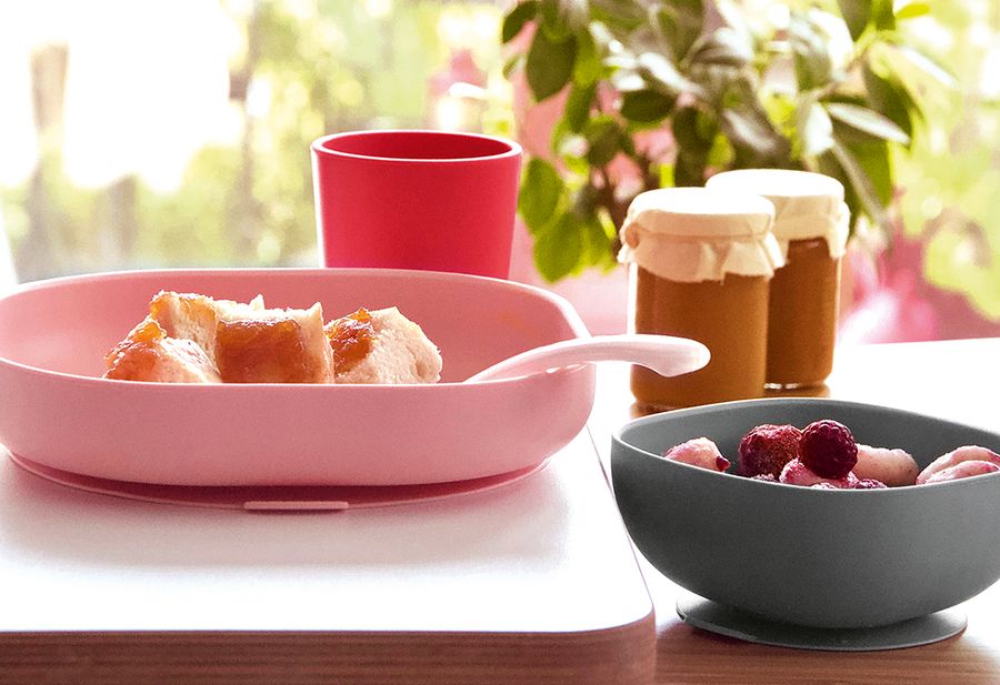 Silikon, Inhalt: 1 Teller und 1 Schüssel mit Saugfuß, 1 Glas und 1 weicher Löffel 2. Altersstufe, ab 4 Monaten, spülmaschinengeeignet, mikrowellengeeignet·rosa