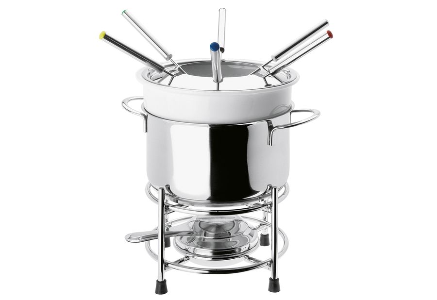 Porzellan / Edelstahl, Inhalt: 1 x Fonduetopf Edelstahl, 1 x Fonduetopf Porzellan, 1 x Spritzschutz, 6 x Fonduegabeln, 1 x Rechaud, 1 x Pastenbrenner (leer), für Käse-, Fleisch- oder Schokoladenfondue, Simmertopf-Prinzip: füllen Sie in den Edelstahltopf 400 ml Wasser, und Ihr Käse, ihre Soße oder Schokolade brennt nie an, einfach zu reinigen·silber / weiß Ø 16 cm·