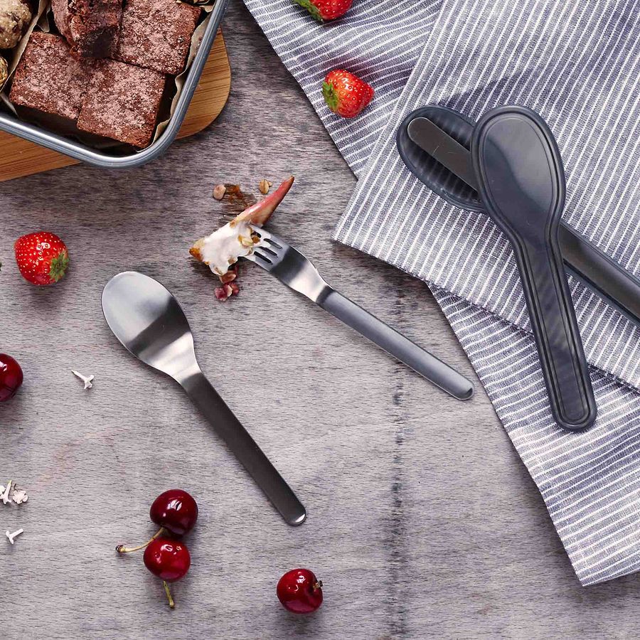 Dieses hochwertige, kompakte Messer-, Gabel- und Löffel-Set aus Edelstahl kann perfekt ineinander gestapelt und somit platzsparend in jeder Tasche verstaut und mühelos getragen werden. Die mit Druckknopf verschließbare Hülle sorgt für den komfortablen und hygienischen Transport. Der hochwertige Edelstahl ist rostfrei, widerstandsfähig und besonders langlebig. Zudem liegt das Besteck gut in der Hand und kann kompakt in der praktischen Mitnahmebox vertaut werden. Mehrfach verwendbar. Edelstahl - statt Plastikbesteck - der Umwelt zu Liebe. Länge: 20 cm.