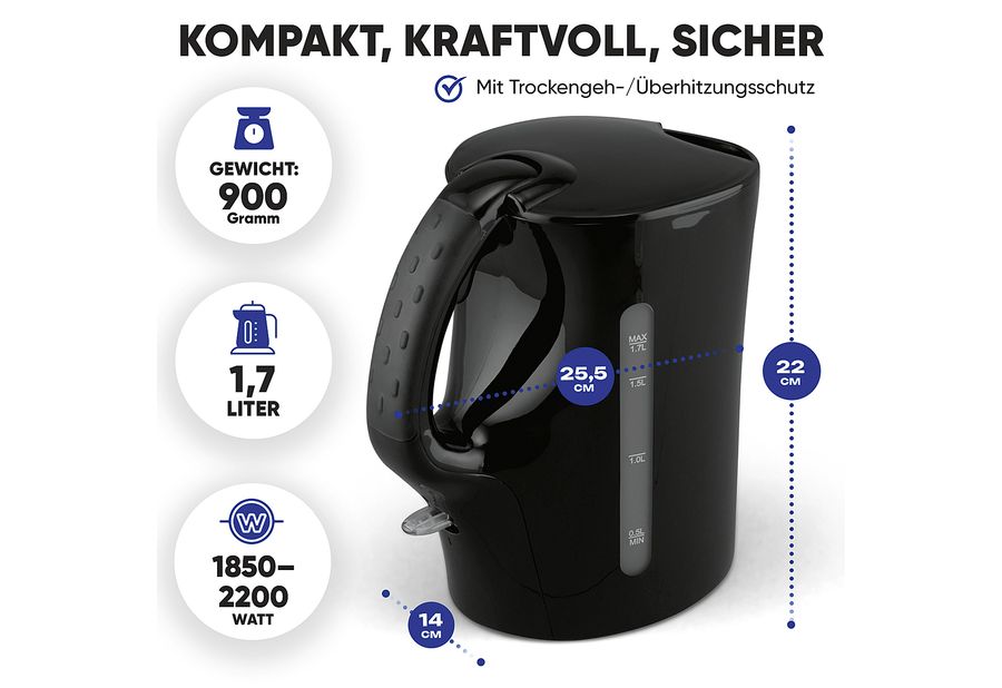 Kunststoff / Metall, Füllmenge bis zu 1,7 Liter, einfache Handhabung durch kabellose Technik – leichtes Ein- und Ausgießen, Sicherheitsklappdeckel mit Einhandbedienung, Kalkfilter (herausnehmbar), Ein-/Ausschalter (beleuchtet), Edelstahlheizelement, automatische und manuelle Abschaltung, 2 außenliegende Wasserstandsanzeigen, rutschfester Soft Touch-Griff, Basisstation mit Kabelaufwicklung, Trockengeh-/Überhitzungsschutz, 220–240 V, 50 Hz, 1850–2200 W·schwarz 1,7 l, (BxHxT): 25,5x22x14 cm