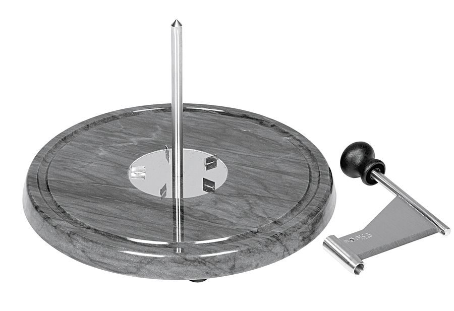 Edelstahl / Kunststoff / Marmor, geeignet für das Schaben von Tête-de-Moine und Schokolade, einfach zu montieren und demontieren, 5 im Sockel befestigte Zapfen - so liegt der Käse immer gut im Griff, Marmorplatte mit Edelstahl-Zentrierstift, spülmaschinenfest, kühlschrankgeeignet·schwarz / silber Ø 22 cm, H 14 cm