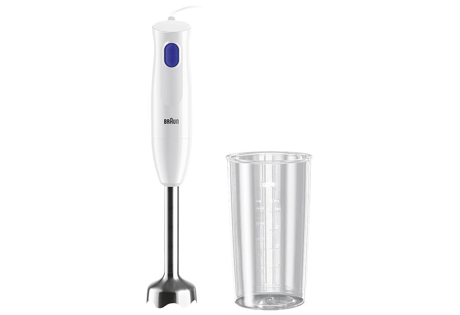 Braun's leichtester Stabmixer (626g) mit Metallschaft, eine Geschwindigkeit - mit einem Tastendruck, 450 Watt Leistung, EasyTwist System - einfach und schnell die Aufsätze mit einem Klick wechseln, abnehmbare Teile spülmaschinefest, Becher 600 ml aus Kunststoff mit Messskala in ml und fl oz·weiß/blau