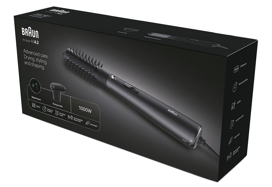 Der leistungsstarke Braun Air Styler AS4.2 wurde speziell für einfaches, schnelles und zuverlässiges Trocknen und Stylen in einem entwickelt. Der überragende HTDC-Motor und die 1000 W Leistung sorgen für einen schnellen Luftstrom, der effizientes Trocknen und Stylen bei niedrigen Temperaturen ermöglicht. 2 Stylingmodi ermöglichen es, die richtige Einstellung für Ihren individuellen Haartyp zu wählen und Ihr Haar sanft und ohne Hitzeschäden zu stylen. Der zusätzliche Kühlmodus fixiert das Styling für lang anhaltende Ergebnisse. Die integrierte IONTEC-Technologie pflegt Ihr Haar, indem sie bis zu 12 Millionen Ionen pro Minute freisetzt, um statische Aufladung zu reduzieren und die Haarkutikula zu versiegeln - für glattes, glänzendes und gesund aussehendes Haar. 2 präzisionsgefertigte Aufsätze lassen sich mit dem Twist & Lock-Mechanismus einfach befestigen. Die ergonomische Düse trocknet das Haar schnell und einfach, während die Thermo-Rundbürste dem Haar vom Ansatz bis zu den Spitzen dauerhaft Volumen und Form verleiht. Beide Aufsätze sind ideal für jede Haarlänge und jeden Haartyp. Der Luftfilter ist zur einfachen Reinigung abnehmbar und verhindert eine Überhitzung für eine längere Lebensdauer. Das 195 cm lange Kabel bietet maximale Flexibilität für Ihr Styling. In Metallic-Schwarz mit Chrom-Akzenten.