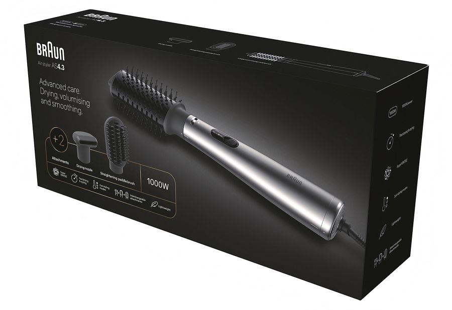 Der leistungsstarke Braun Air Styler AS4.3 wurde speziell für einfaches, schnelles und zuverlässiges Trocknen und Stylen in einem entwickelt. Der überragende HTDC-Motor und die 1000 W Leistung sorgen für einen schnellen Luftstrom, der effizientes Trocknen und Stylen bei niedrigeren Temperaturen ermöglicht. 2 Stylingmodi ermöglichen es Ihnen, die richtige Einstellung für Ihren individuellen Haartyp zu wählen und Ihr Haar sanft und ohne Hitzeschäden zu stylen. Der zusätzliche Kühlmodus fixiert das Styling für lang anhaltende Ergebnisse. Erleben Sie fortschrittliche Haarpflege mit der integrierten Super IONTEC-Technologie, die bis zu 32 Millionen Ionen pro Minute freisetzt, um statische Aufladung effektiv zu reduzieren und die Haarkutikula zu versiegeln - für glattes, glänzendes und gesund aussehendes Haar. 3 präzisionsgefertigte Aufsätze lassen sich mit dem Twist & Lock-Mechanismus einfach befestigen. Die ergonomische Düse trocknet Ihr Haar schnell und einfach. Die große, ovale Volumenbürste sorgt für dauerhaftes Volumen und Form und ist auch für längeres Haar ideal. Die Glättbürste glättet Ihr Haar sanft und ohne Hitzeschäden. Der Luftfilter ist zur einfachen Reinigung abnehmbar und verhindert eine Überhitzung für eine längere Lebensdauer. Das extralange 220 cm lange Kabel sorgt für maximale Flexibilität bei Ihrem Styling. Das Tool ist in einem hochwertigen hellgrauen Satin-Effekt mit schönen Chromdetails gefertigt.