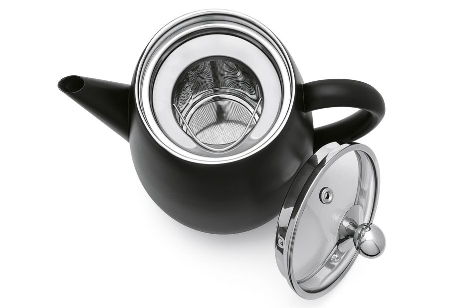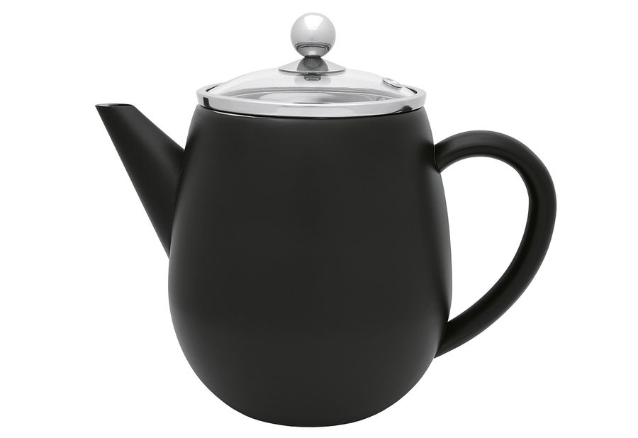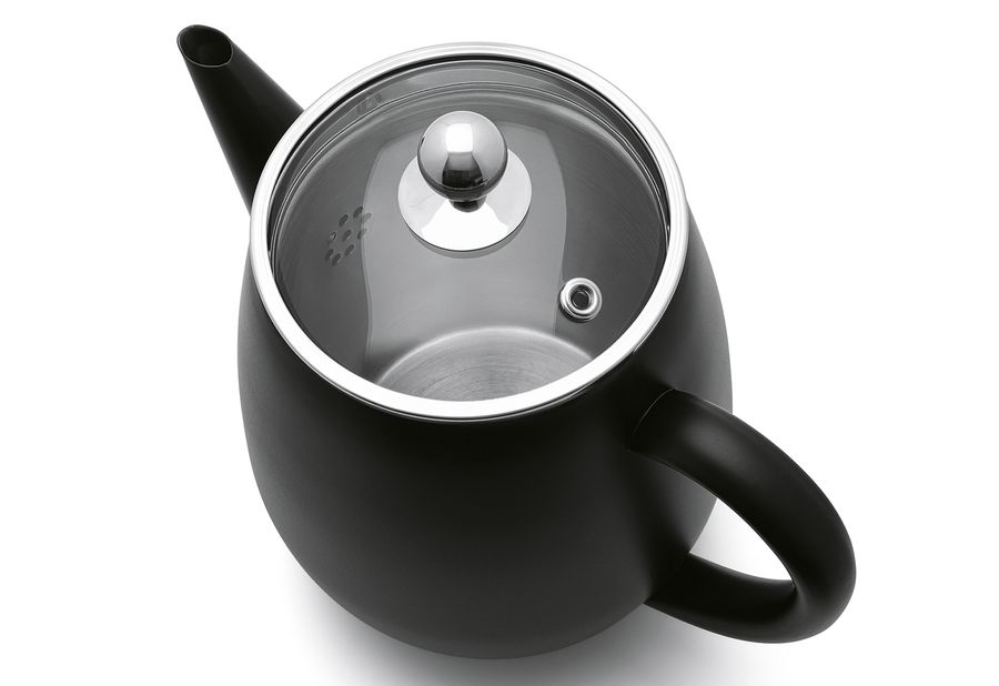 Edelstahl, Deckel aus Glas, doppelte Isolierwand, Tee bleibt hierdurch eine Dreiviertelstunde bis zu einer Stunde lang heiß und geschmackvoll (wenn die Teekanne mindestens bis zu 90 % gefüllt ist), Tülle hat ein besonderes Design und tropft beim Einschenken nicht, Griff und Deckelknopf werden allenfalls handwarm, spülmaschinengeeignet, nicht mikrowellengeeignet·schwarz matt 1,1 l, (LxBxH): 23x14,5x19,5 cm·Fachhandel exklusiv·