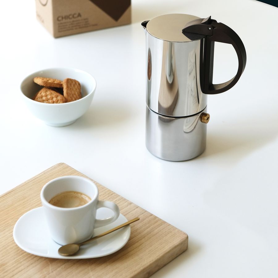 Der Espressokocher Chicca präseniert sich in klassisch-zeitlosem Edelstahl-Design. Die runde, gradlinige Form verleiht dem Kocher ein besonders ansprechendes Aussehen und besondere Eleganz. Ein zeitloser Klassiker.