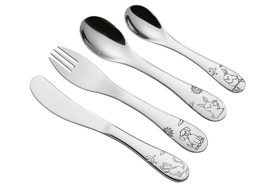 Edelstahl rostfrei, bedruckt, ergonomische Form ideal für Kinderhände, Inhalt: Messer (21 cm), Gabel (21 cm), Löffel (20 cm), kleiner Löffel (17 cm)·Fachhandel exklusiv