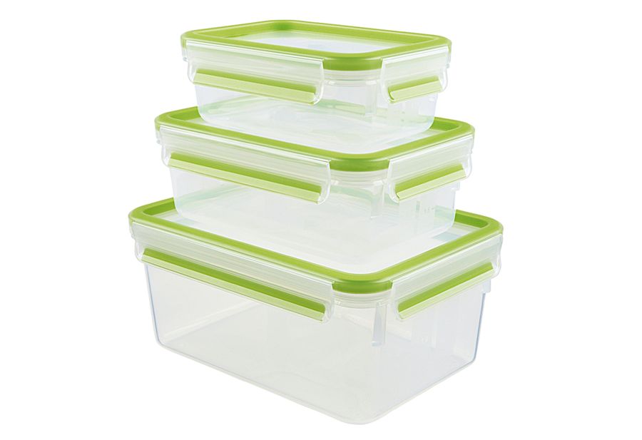 Deckel / Unterteil Kunststoff Polypropylen (PP), eingespritzes Gummi besteht aus Thermoplastischen Elastomeren (TPE), transportsicherer Clipverschluss, mit EMSA FRISCHE-Dichtung, platzsparend ineinander stapelbar, geeignet für Babynahrung, gefrierschrankgeeignet, mikrowellengeeignet, spülmaschinengeeignet, Inhalt: 550 ml (16,3x11,3x5,8 cm), 1 l (19,5x13,5x7 cm), 2,3 l (22,5x16,3x9,9 cm)·hellgrün / transparent 1 x 550 ml, 1 x 1 l, 1 x 2,3 l