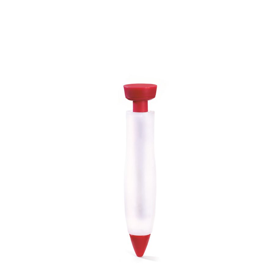 Dekorationsstift. Kinderleicht zu handhaben ist dieser Stift beim Dekorieren von Speisen und Serviertellern. Durch leichten Druck auf die Seiten des Silikonkörpers können Sie fein justieren. Das Vakuum, welches beim Befüllen entsteht, zieht die Flüssigkeit beim Lösen des Drucks sofort wieder zurück, so dass Sie leicht auch nur Punkte setzen können. Lassen Sie Ihrer Phantasie freien Lauf und peppen Sie Servierteller, Teige, Desserts und Getränke auf wie ein Profi. Mit der roten Reduziertülle haben Sie eine 1 mm Schriftbreite und ohne 3 mm. Nachfüllen einfach wie das Aufziehen einer Spritze. Spülmaschinenfest. Füllmenge: 16 ml.