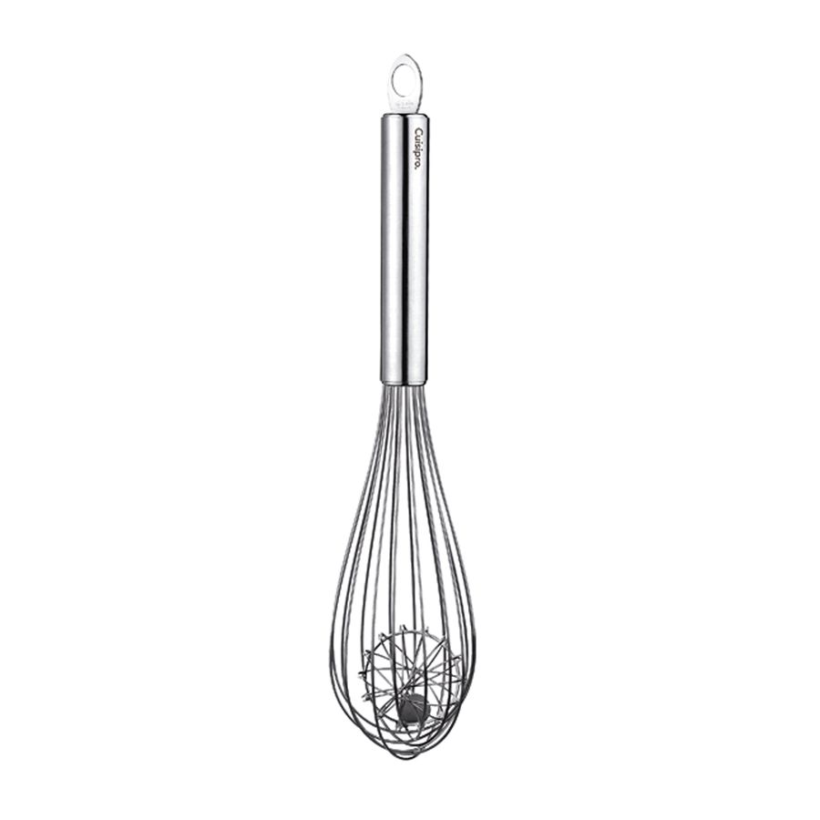 Duo-Schneebesen mit integriertem Drahtball. Draht aus rostfreiem Edelstahl, der einen Ball mit einer Keramikmurmel umschließt. Acht Drähte. Der Ball, der durch die Murmel beschwert wird, bewegt sich beim Rühren, um die Luftzufuhr für die Zutaten zu erhöhen. Der Duo-Schneebesen ermöglicht ein leichteres Schlagen von Eiern oder gemixten Zutaten. Im Vergleich zu gewöhnlichen Schneebesen schafft unser Produkt ein lockeres Eiweiß und fluffigen Schaum. Angemeldetes US Patent.