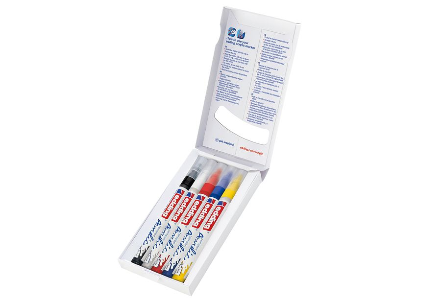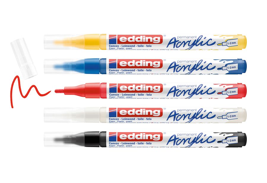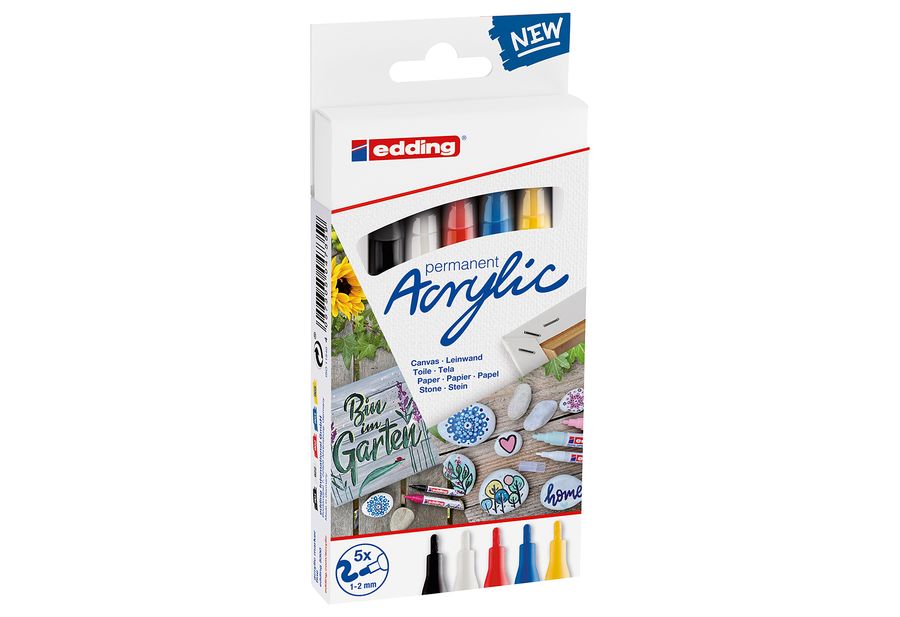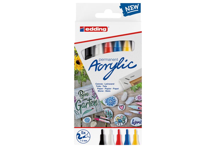Strichstärke: 1 - 2 mm, Rundspitze, Inhalt: je 1 x schwarz, verkehrsrot, enzianblau, sonnengelb, verkehrsweiß, zum Malen auf hellen oder dunklen Oberflächen, ideal für Materialien wie Leinwand, Holz, Stein, Terrakotta oder Malpapier, hochwertige pigmentierte Acrylfarbe auf Wasserbasis, stark deckend, lichtbeständig, geruchsarm und nach dem Trocknen permanent