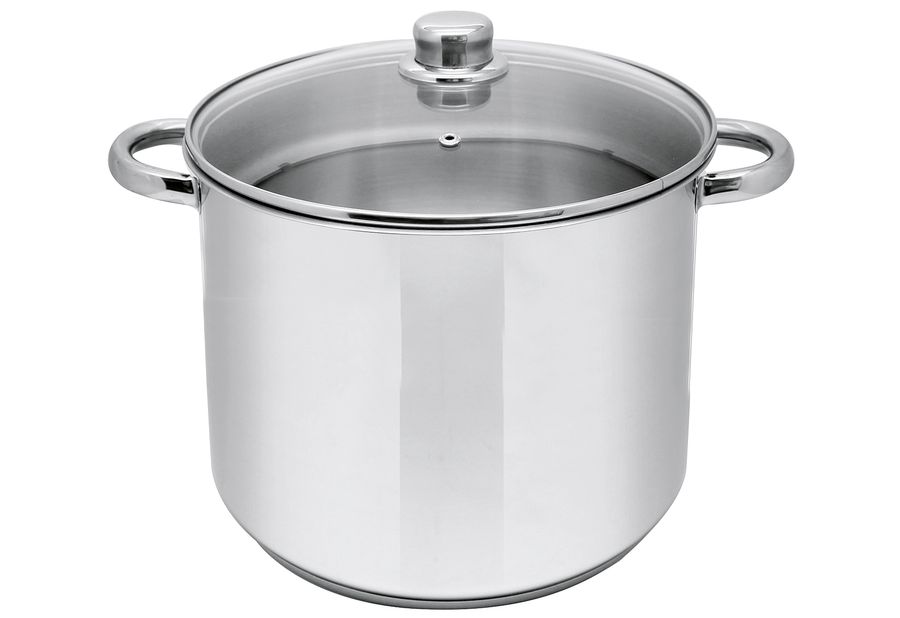 Edelstahl, Wandstärke ca. 0,6 mm- 0,7 mm, Gesamtbodenstärke ca. 3,1 mm, innen hochglänzend mit Literskala, außen hochglanzpoliert, gerade Form mit Abgießrand, Glasdeckel mit stoßfestem Edelstahlrand und Edelstahlkugelknopf, sowie Entlüftungsloch, Edelstahlhohlgriffe, spülmaschinengeeignet, für alle Herdarten geeignet, auch für Induktion Ø 26 cm, 14 l