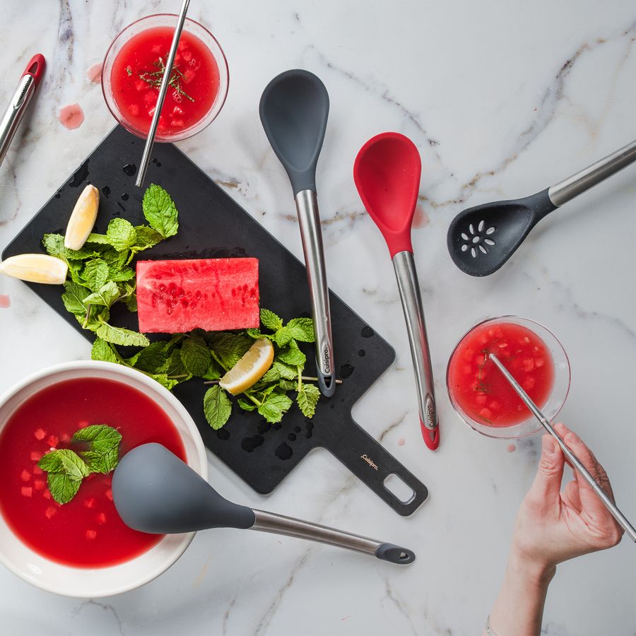 Kochen und Servieren Sie köstliche Mahlzeiten mit den hochwertigen Silikon Küchenhelfern. Diese formschönen Produkte werden aus satiniertem & poliertem Stahl und Antihaft-Silikon hergestellt. Durch die langlebige Bauweise, einer Hitzebeständigkeit bis zu 300°C (572°F) und das elegante Design können diese Küchenhelfer überall zwischen Herd und Tisch perfekt eingesetzt werden.