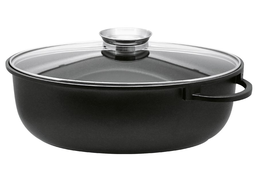 Aluminiumguss, Wandstärke ca. 2,8 mm, Bodenstärke ca. 5,0 mm, gelochter Induktionsboden, innen kratzfeste ELODUR® Select Antihaftversiegelung, außen Silikon Polyester beschichtet, eingearbeitete Seitenbeschlagteile aus Aluguss, Glasdeckel mit stoßfestem Edelstahlrand und Aromaknopf, für alle Herdarten geeignet, sehr leichte Reinigung, da nichts haften bleibt, gleichmäßige Wärmeverteilung bis zum Rand, spart Zeit und Energie, mit Glasdeckel backofenfest bis 180°C, ohne Glasdeckel bis 240°C, spülmaschinengeeignet, ohne PFAS·schwarz 7 l, (LxBxH): 38x25x13,4 cm