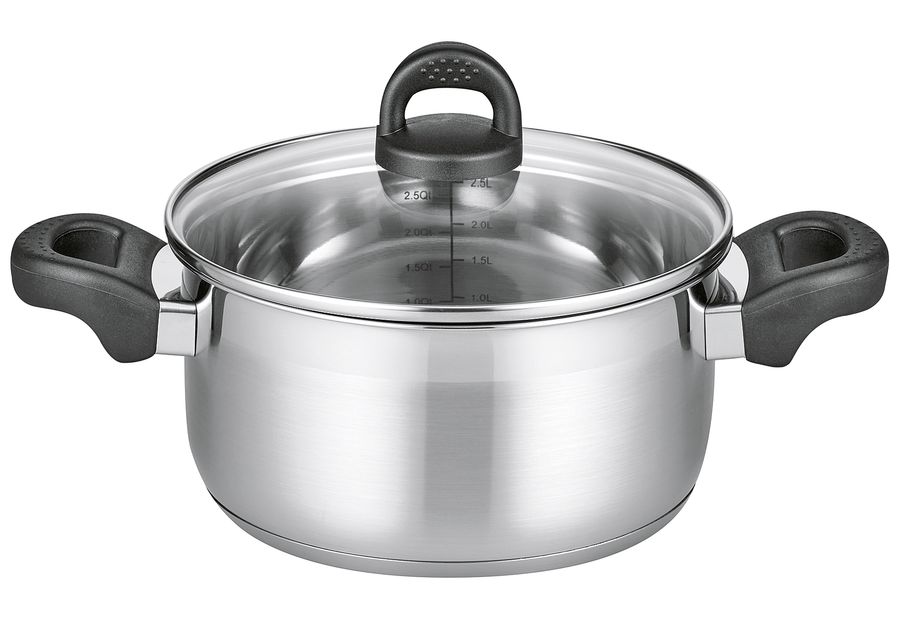 Edelstahl 18/8 - 18/10, Wandstärke ca. 0,5 mm, Gesamtbodenstärke ca. 3,0 mm, Kapsel-Sandwich-Boden mit Aluminium-Kern, zylindrische Form mit Abgießrand, innen hochglanzpoliert, mit integrierter Volumenskala, mit integriertem Öl-Dosier-System, außen satiniert mit hochglanzpoliertem DeKo-Rand, rutschfeste schwarze Kunststoffgriffe mit Edelstahlflammenschutz, hochgewölbter Glasdeckel mit stoßfestem Edelstahlrand und Kunststoffknopf, mit Fingerschutzplatte, spülmaschinengeeignet, für alle Herdarten geeignet, auch für Induktion Ø 20 cm