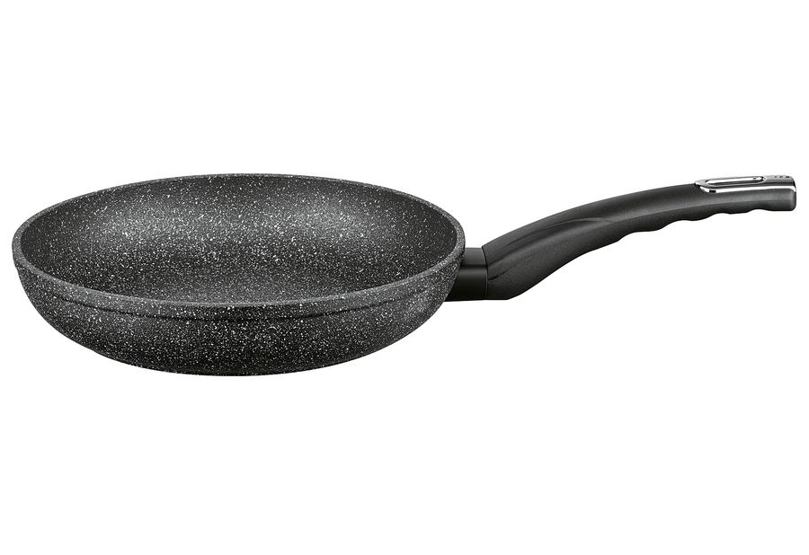 geschmiedetes Aluminium mit hochwertiger ELODUR® Antihaftversiegelung, Kunststoffstiel mit Flammenschutz und Edelstahlapplikation, kratzfest, spezielle, extra raue Oberfläche, für besonders knuspriges Braten, energiesparend durch gleichmäßige Wärmeverteilung bis zum Rand, für alle Herdarten geeignet·schwarz Ø 28 cm, H 6 cm