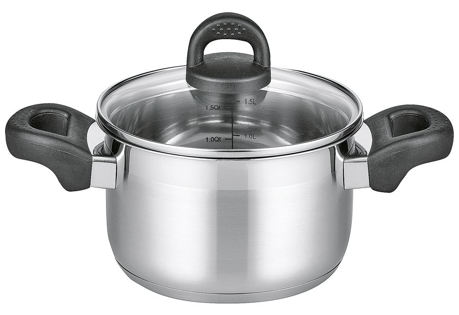 Edelstahl 18/8 - 18/10, Wandstärke ca. 0,5 mm, Gesamtbodenstärke ca. 3,0 mm, Kapsel-Sandwich-Boden mit Aluminium-Kern, zylindrische Form mit Abgießrand, innen hochglanzpoliert, mit integrierter Volumenskala, mit integriertem Öl-Dosier-System, außen satiniert mit hochglanzpoliertem DeKo-Rand, rutschfeste schwarze Kunststoffgriffe mit Edelstahlflammenschutz, hochgewölbter Glasdeckel mit stoßfestem Edelstahlrand und Kunststoffknopf, mit Fingerschutzplatte, spülmaschinengeeignet, für alle Herdarten geeignet, auch für Induktion Ø 16 cm