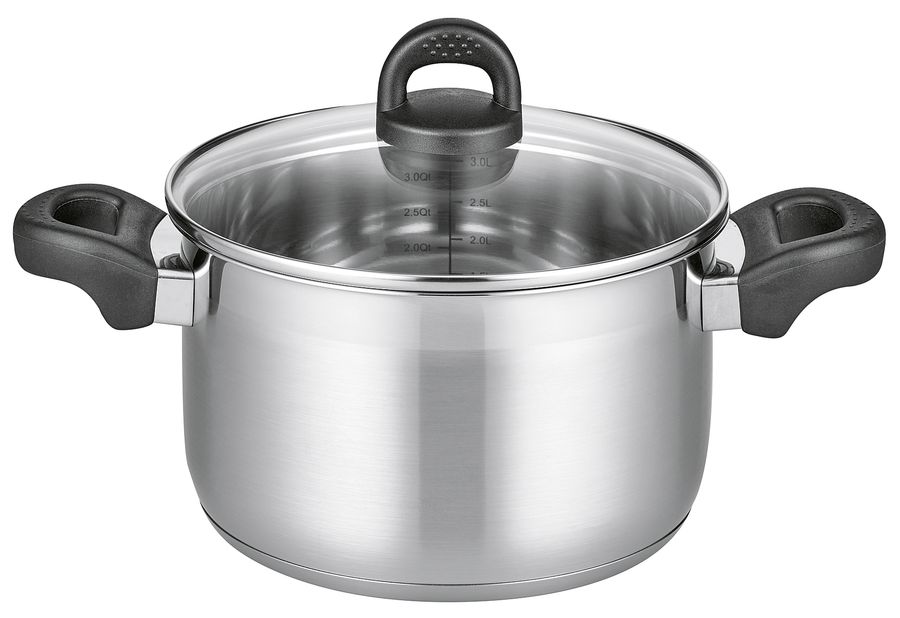 Edelstahl 18/8 - 18/10, Wandstärke ca. 0,5 mm, Gesamtbodenstärke ca. 3,0 mm, Kapsel-Sandwich-Boden mit Aluminium-Kern, zylindrische Form mit Abgießrand, innen hochglanzpoliert, mit integrierter Volumenskala, mit integriertem Öl-Dosier-System, außen satiniert mit hochglanzpoliertem DeKo-Rand, rutschfeste schwarze Kunststoffgriffe mit Edelstahlflammenschutz, hochgewölbter Glasdeckel mit stoßfestem Edelstahlrand und Kunststoffknopf, mit Fingerschutzplatte, spülmaschinengeeignet, für alle Herdarten geeignet, auch für Induktion Ø 20 cm
