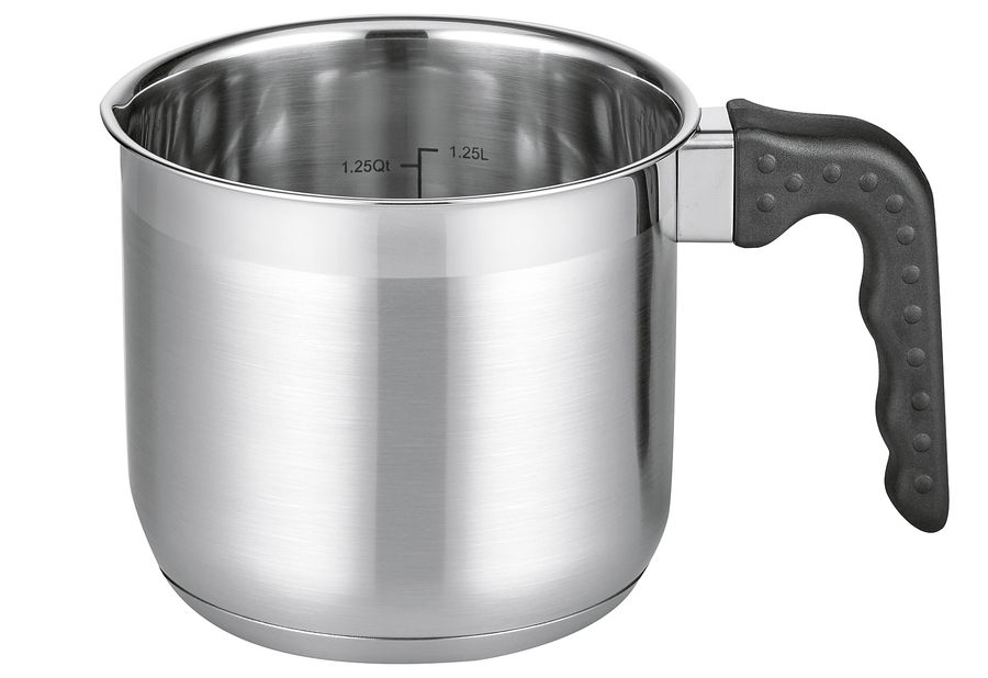 Edelstahl 18/8 - 18/10, Wandstärke ca. 0,5 mm, Gesamtbodenstärke ca. 3,0 mm, Kapsel-Sandwich-Boden mit Aluminium-Kern, zylindrische Form mit Abgießrand, innen hochglanzpoliert, mit integrierter Volumenskala, mit integriertem Öl-Dosier-System, außen satiniert mit hochglanzpoliertem DeKo-Rand, rutschfester schwarzer Kunststoffgriff mit Edelstahlflammenschutz, mit Fingerschutzplatte, spülmaschinengeeignet, für alle Herdarten geeignet, auch für Induktion Ø 14 cm