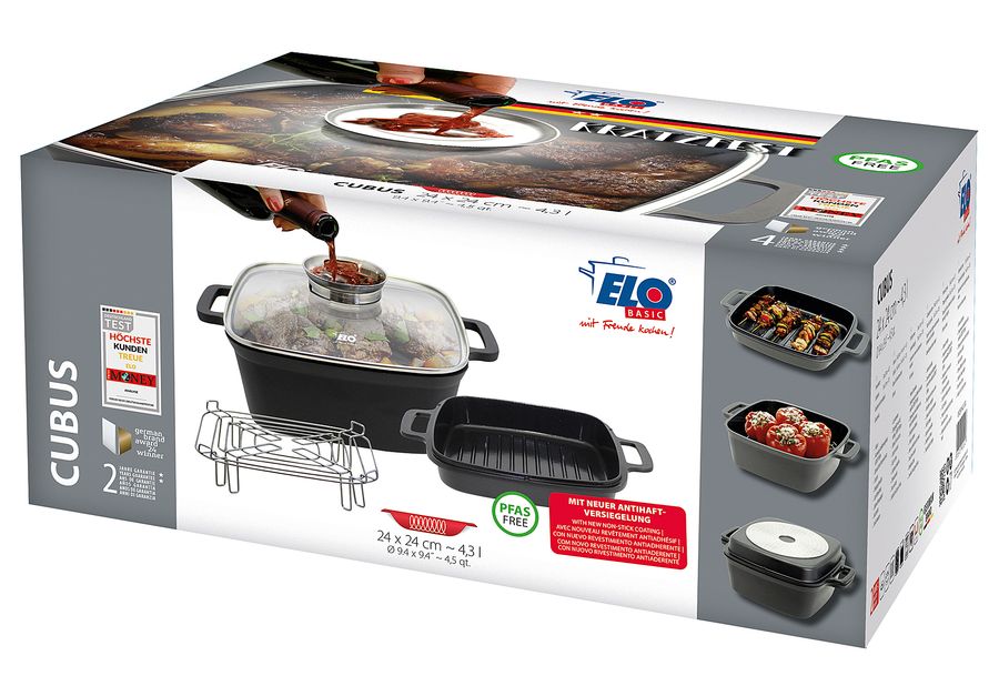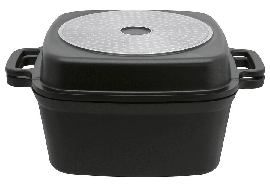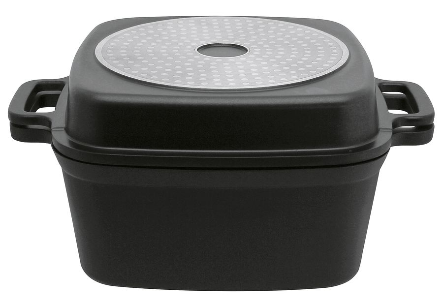 Aluminiumguss, Inhalt Set: Topf, Aluguss-Deckel mit eingearbeiteten Griffen und Grillrippen, Edelstahl-Dünsteinsatz, Glasdeckel mit stoßfestem Edelstahlrand und Aromaknopf, Wandstärken ca. 1,8 mm, Bodenstärken ca. 3,7 mm, gelochter Induktionsboden, innen schwarze, kratzfeste ELODUR® Edition Antihaftversiegelung, außen matt schwarz Silikon Polyester beschichtet, für alle Herdarten geeignet, backofenfest bis 240°C (mit Glasdeckel bis 180°C), spülmaschinengeeignet·schwarz 6 l, Ø 24 cm, H 10,5 cm