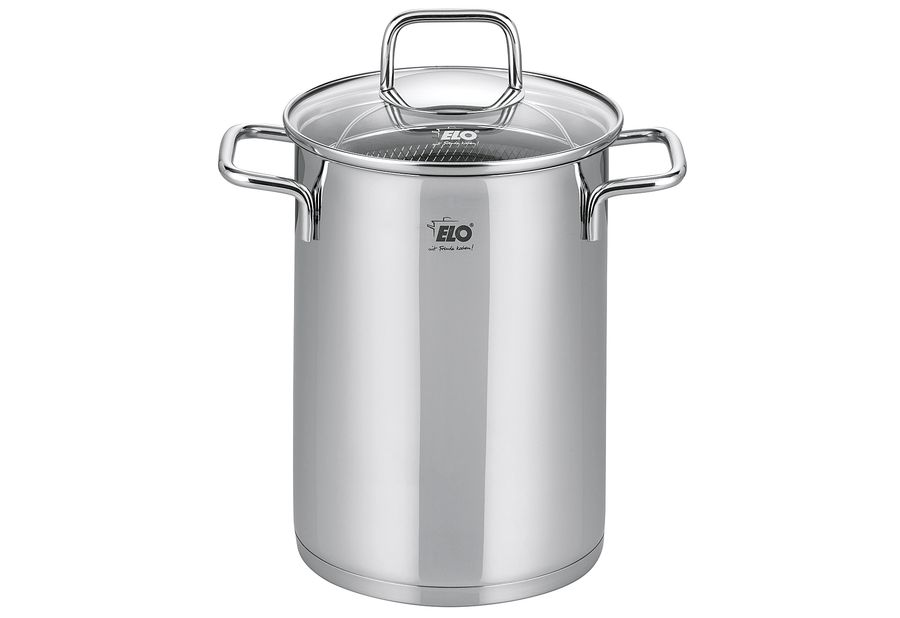 Edelstahl 18/8 -18/10, Wandstärke ca. 0,6 mm, Bodenstärke ca. 4,1 mm, verkapselter Hartlötboden innen satiniert mit Volumenskala, außen hochglanzpoliert mit ELO Logo, Edelstahl Drahtgriffe, geschweißt Glasdeckel mit stoßfestem EDS Ring und weißem ELO Logo, EDS Bügelgriff mit Fingerschutzplatte, spülmaschinengeeignet, für alle Herdarten geeignet, auch für Induktion Ø 16 cm