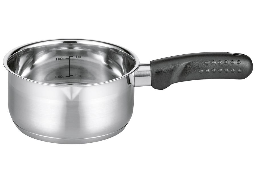 Edelstahl 18/8 - 18/10, Wandstärke ca. 0,5 mm, Gesamtbodenstärke ca. 3,0 mm, Kapsel-Sandwich-Boden mit Aluminium-Kern, zylindrische Form mit Abgießrand, innen hochglanzpoliert, mit integrierter Volumenskala, mit integriertem Öl-Dosier-System, außen satiniert mit hochglanzpoliertem DeKo-Rand, rutschfester schwarzer Kunststoffgriff mit Edelstahlflammenschutz, mit Fingerschutzplatte, spülmaschinengeeignet, für alle Herdarten geeignet, auch für Induktion Ø 16 cm