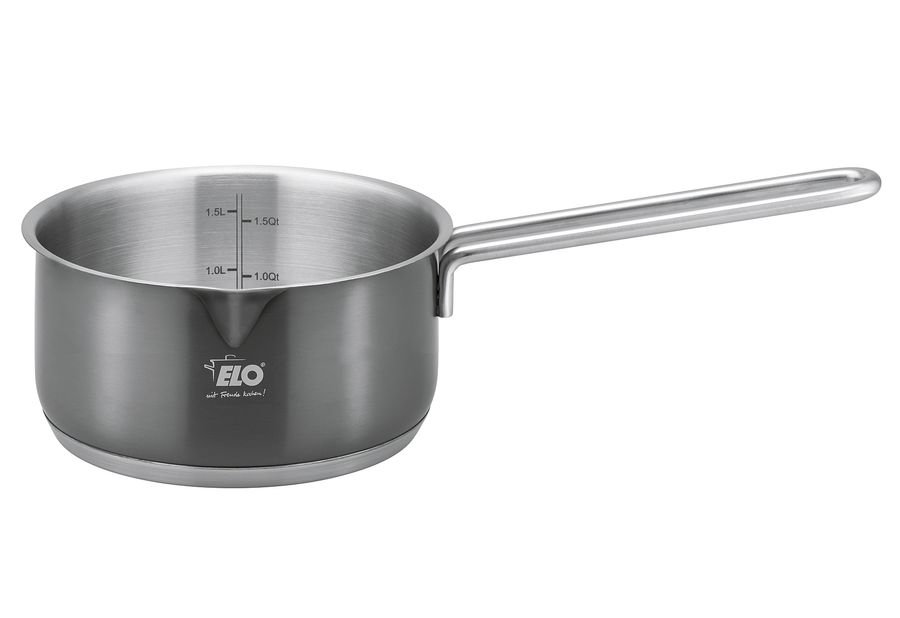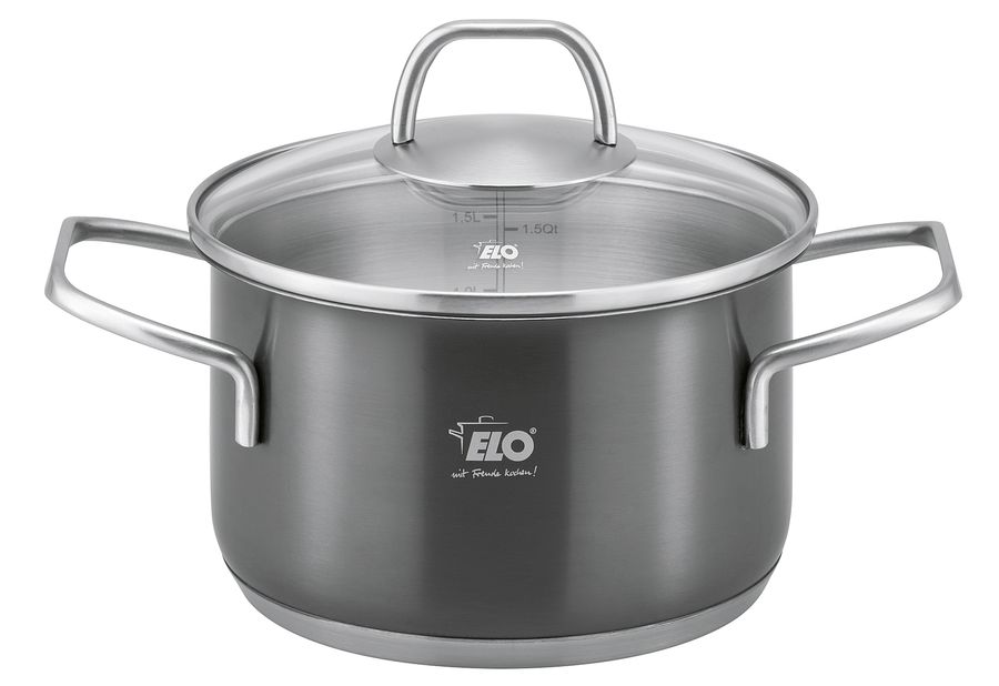 Edelstahl 18/10, Inhalt: 1 x Fleischtopf mit Glasdeckel Ø 16 cm, 1,7 l, 1 x Fleischtopf mit Glasdeckel Ø 20 cm, 3,3 l, 1 x Fleischtopf mit Glasdeckel Ø 24 cm, 5,7 l, Stielkasserolle mit Ausguss Ø 16 cm, 1,3 l, mit energiesparendem Kapselboden, innen satiniert mit Literskala und Öl-Dosiersystem, Topfkörper außen mit schwarzer, transparenter PVD Oberflächenveredelung, Topfboden satiniert, kratz- und verschleißfest, hitzebeständig, Edelstahl Drahtgriffe, geschweißt, Glasdeckel mit stoßfestem EDS-Ring, EDS-Bügelgriff mit Fingerschutzplatte, spülmaschinengeeignet, backofenfest bis 240 °C ohne Deckel (mit Glasdeckel 180 °C), für alle Herdarten geeignet inkl. Induktion·grau