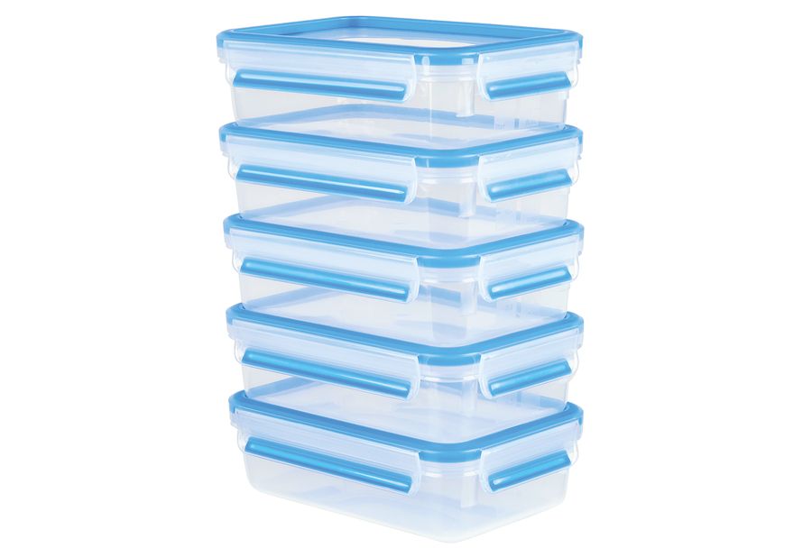 Kunststoff, Inhalt: 5 Frischhaltedosen mit Deckel, transportsicher und hygienisch, einfaches Öffnen und Schließen, Frische-Dichtung im Deckel, 100 % auslaufsicher, 100 % hygienisch, mikrowellengeeignet, spülmaschinengeeignet·blau / klar 800 ml, (LxBxH): 13,6x19,7x5,9 cm