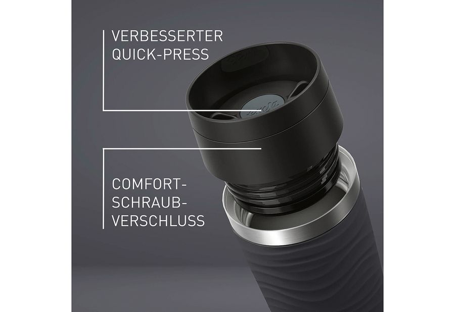Edelstahl mit Soft-Touch-Sleeve im Wellendekor, hält Getränke bis zu 4 Stunden heiß oder 8 Stunden kalt, 100% dicht, auslaufsicher, rutschfester Boden, verbesserter Quick-Press-Verschluss, Comfort-Schraubverschluss, 360°-Trinköffnung, spülmaschinenfest·schwarz 350 ml