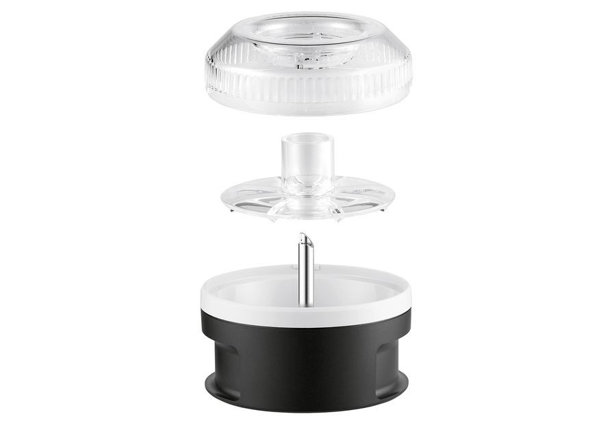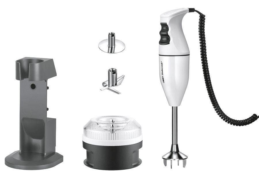 Soft-Touch-Membranschalter, Ergonomisches Griffdesign, Kurzbetriebszeit: 5 Minuten, Langlebiger, robuster AC-Motor, Made in Switzerland, Flüssigkeitsmenge ca. 10 l (bei ca. 30 cm Gefäßdurchmesser), Mit Prozessor zum Zerkleinern oder Mahlen von bspw. Gewürzen, Nüssen oder Zucker, Inklusive Pulverscheibe zum optimalen Verarbeiten kleinerer Mengen, 5 Jahre Garantie, Leistung: 120 W, 220-240 V~, 50/60 Hz, Stufe 1: 7.000 U/min, Stufe 2: 10.000 U/min, Spiralkkabel: ca. 60 cm, ausziehbar bis zu 150 cm, Farbe: Weiß, Zubehör: Multimesser, Schlagscheibe, Prozessor inkl. Pulverscheibe, Stativ, Bedienungsanleitung mit Rezepten·weiß (BxTxH): 6,5x9,7x35 cm·weitere passende Zubehörteile finden Sie im hinteren Teil des Kataloges