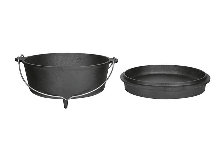 Gusseisen / Metall / Eschenholz, mit 3 Füßen, inklusive Deckelheber, ein Dutch Oven ist ein traditioneller, dickwandiger Kochtopf aus Gusseisen, der seit vielen Jahrhunderten verwendet wird, dank des Materials wird die Wärme gleichmäßig über den gesamten Topf verteilt und erwärmt so die Speisen von allen Seiten, Kohle oder Briketts können zusätzlich noch auf dem Deckel platziert werden, um so noch extra Wärme von oben zu erzeugen, durch das Umdrehen des Deckels kann dieser auch als zweite Pfanne verwendet werden, in der umgedrehten Version verfügt der Deckel über einen geriffelten Boden, dank der drei Füße steht der Dutch Oven sicher in und über dem Feuer, alternativ kann er auch an den zwei Henkeln über das Feuer gehängt werden, die jeweils eine Kerbe für einen Haken haben, mit dem mitgelieferten Deckelheber, lässt sich der heiße Deckel problemlos anheben