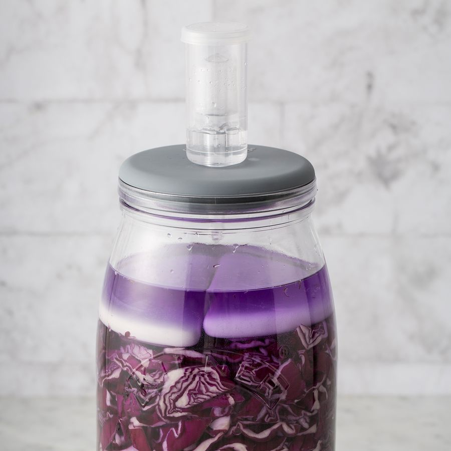 Das Kilner® Fermentations-Set ist die wohl einfachste Möglichkeit Gemüse auf natürliche Art und Weise zu konservieren. Fermentiertes Gemüse enthalten besonders viele Vitamine, Mineralien und probiotische Kulturen und ist, wenn selbstgemacht, frei von jeglichen Zusatzstoffen. Das Kilner Fermentier-Set eignet sich perfekt für die Erstellung von Sauerkraut, Kimchi, Gurken, Rotkraut und vielem mehr. Im Kilner Fermentierglas ist die Herstellung besonders einfach – denn dank dem Entlüftungsventil im Deckel läuft der Gär-(Fermentier-) Prozess eigenständig ab. Füllen Sie dazu das Fermentierglas mit Ihrem Lieblingsgemüse, Wasser und Salz auf. Füllen Sie das Ventil bis zur Hälfe mit Wasser so dass Sauerstoff während des Gärprozesses aus dem Glas entweichen kann, der Fermentierungsprozess verläuft dann nahezu von selbst. Rezepte und Gebrauchsanweisung inklusive. Fassungsvermögen: 3 Liter.