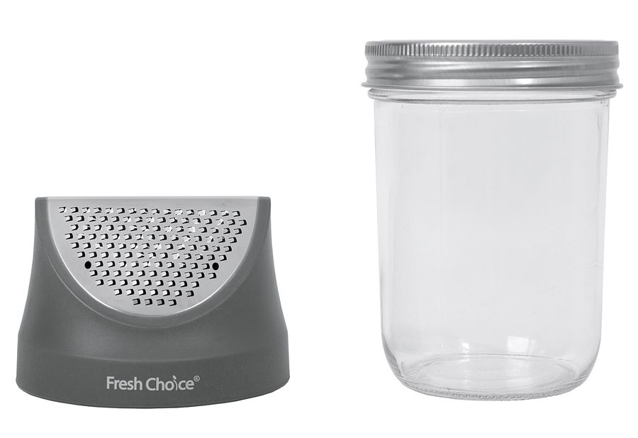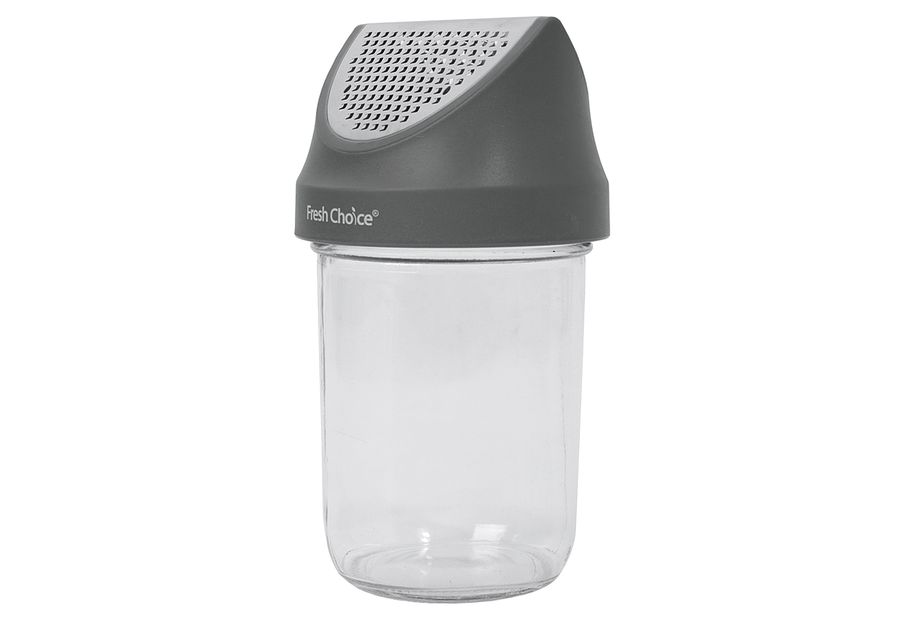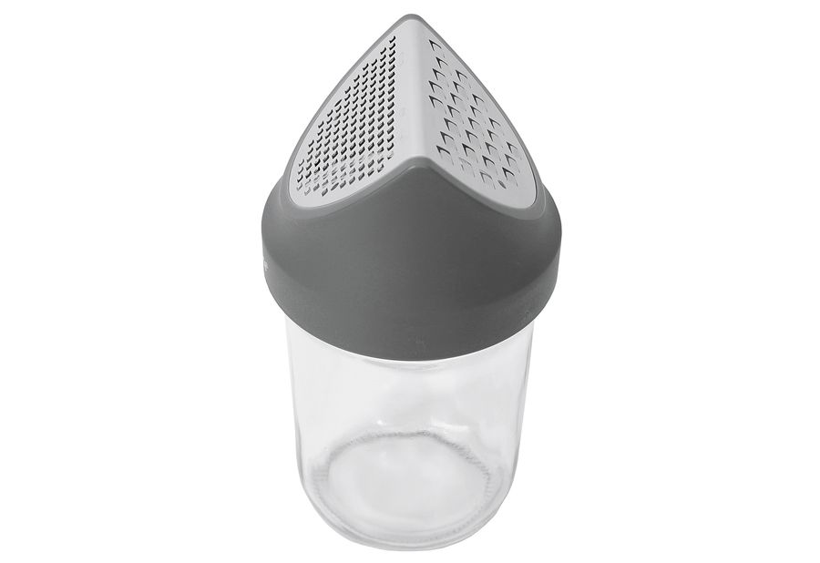Glas / Kunststoff, Inhalt: Aufsatz mit grober und feiner Reibefläche, Glas und luftdichtem Deckel, passt auf alle Schraubgläser mit TO-82 Schraubmündung, die optimale seitliche Neigung der jeweiligen Reibefläche reduziert die Belastung von Handgelenk und Arm, mit geätzten Klingen für müheloses Reiben, feine Klinge für Zimtstangen, Muskatnüsse, Schokolade, Zitronenschale und Hartkäse, grobere Klinge ideal für das Reiben von Kokosnussfleisch, weichem Käse, Möhren, Kartoffeln, Rettich oder z.B. Zucchini, spülmaschinengeeignet·grau 350 ml, Ø 9,4 cm, H 19,3 cm