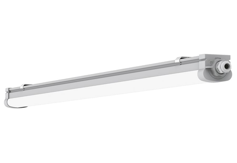 Schlagfestes Leuchtengehäuse und Stirnteile aus Polycarbonat, hellgrau, schwer entflammbar. Schnellmontageleuchte mit von außen zugänglicher Anschlussklemme, inkl. 3 x 1,5 mm² Durchgangverdrahtung. Bei einem Leitungsschutzschalter mit der Charakteristik B und einem Nennstrom von 10 A, können bis zu 56 Leuchten hintereinander betrieben werden. Schutzart IP 66, Schlagschutz IK 08, inkl. LED-Treiber·solange Vorrat reicht