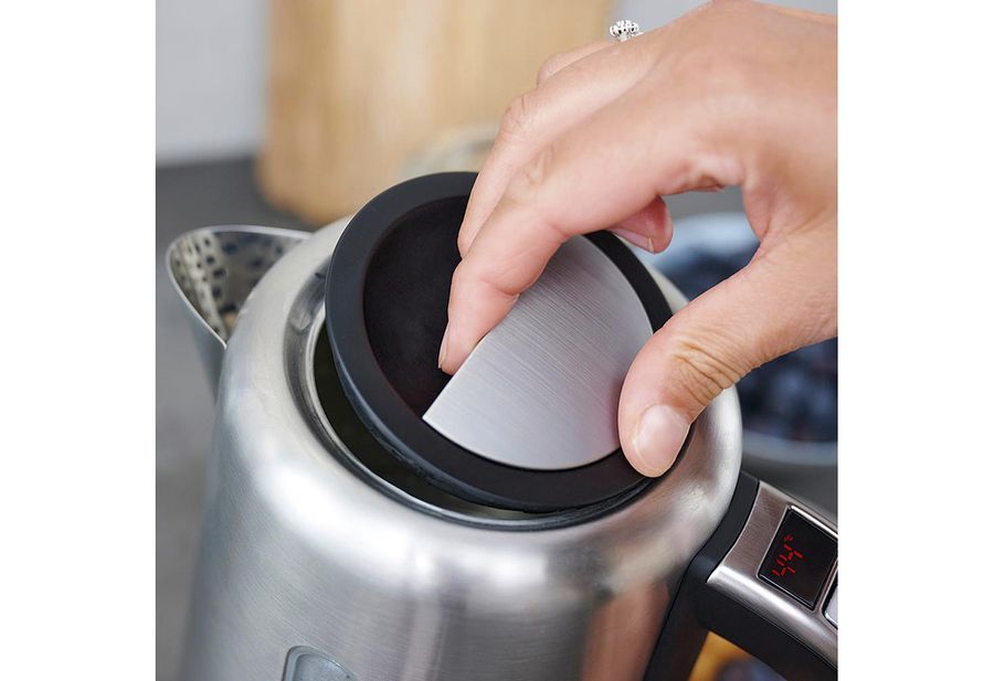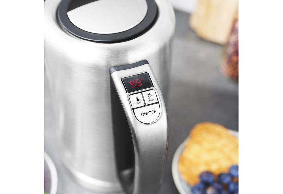 Edelstahl-Behälter mit 1,7 Liter Volumen und Füllstandsanzeige, Wassertemperatur variabel einstellbar in 10 Stufen von 50°C bis 100°C in 5°C Schritten, beleuchtetes Bedienfeld, gradgenaue Anzeige der Wassertemperatur, automatische Warmhaltefunktion (30 min) mit Temperaturanzeige, ergonomischer Handgriff, akustisches Signal, Abschaltautomatik und Trockengehschutz, 360° Basisstation / kabellos, Kabelaufwicklung, Leistung: 3.000 Watt (max.), Schukostecker CEE 7/7