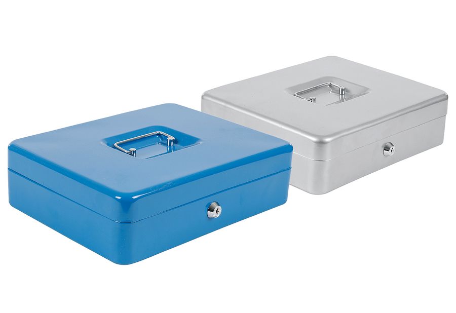 Stahl lackiert, mit Henkel, 2 Schlüsseln und praktischem Einsatz zum einfachen, übersichtlichen Verstauen von Münzgeld·grau, blau (LxBxH). 30x9x23,5 cm