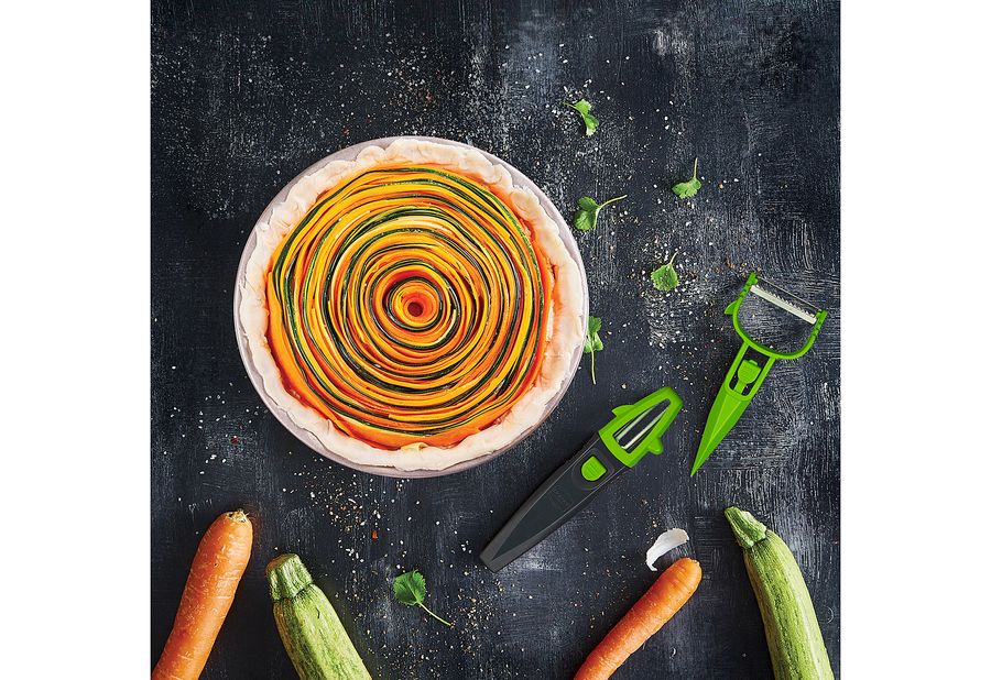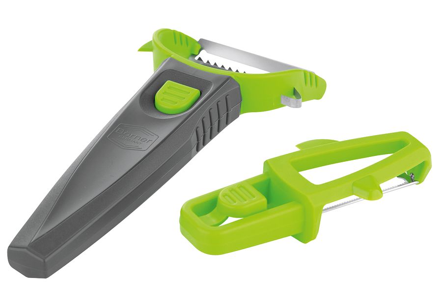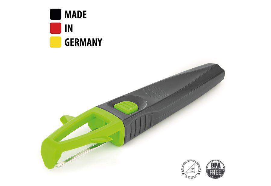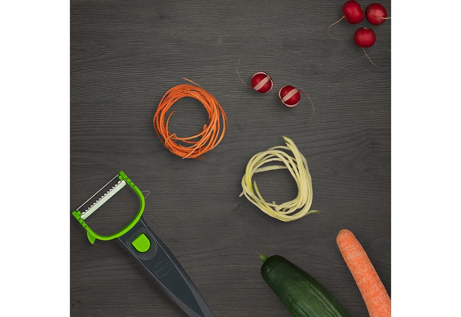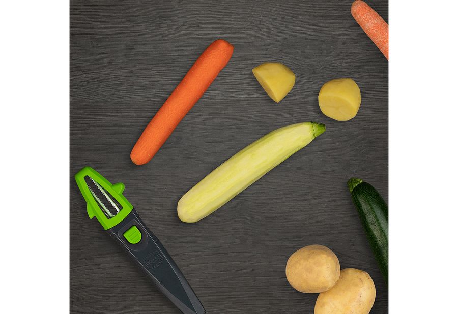 Kunststoff, 3-in1: 1 Multigriff mit 3 wechselbaren Schäler-Aufsetzen: der Julienne Schneider für leckere Gemüsespaghettis, der Stabschäler mit Ausstechfunktion für z.B. Kartoffelaugen, der Y-Schäler für feine Gemüsestreifen, ist auch als Zitrus- & Orangenöffner geeignet, da zusätzlich eine scharfe Spitze an der Seite vorhanden ist·grün