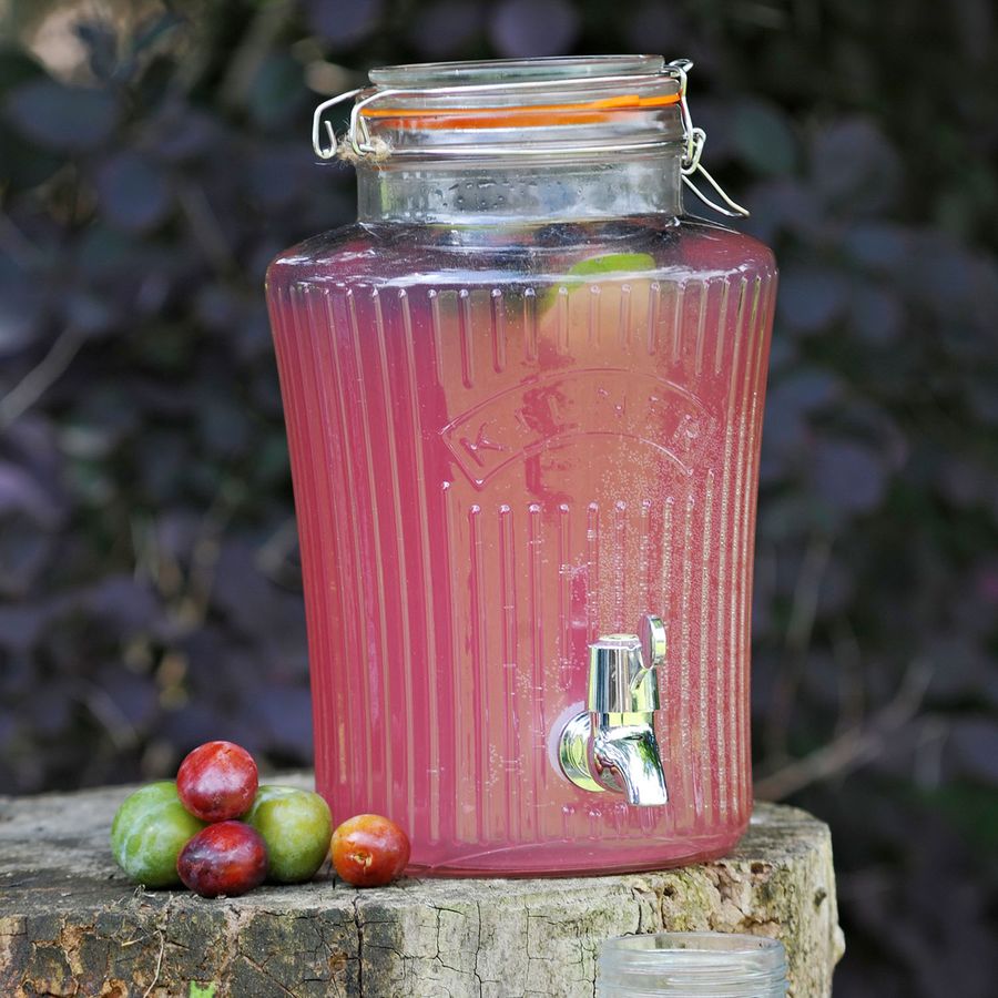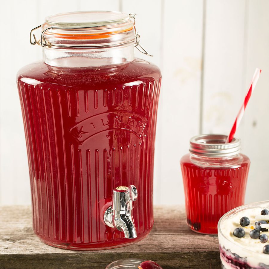 Kultig, stylisch und praktisch zugleich. Der Kilner Getränkespender bewahrt Ihre Getränke nicht nur sicher und frisch auf – sondern macht auch den Ausschank besonders einfach und sauber. So können Sie Ihre Gartenparty genießen, während ihre Gäste sich mit Freude die Getränke selber zapfen - einfach und kleckerfrei. Ob Limonade, Saft, Cocktails oder Bowle in diesem Getränkespender werden alle Getränke gut aufbewahrt – besonders lecker präsentiert sich auch erfrischendes Wasser mit Kräutern oder Scheiben von Zitrusfrüchten, die im Gefäß besonders köstlich aussehen. Auch Eiswürfel können Sie mit Leichtigkeit hinzufügen – für langgekühlte Getränke. Auch im Alltag ist der Getränkespender die ideale Abwechslung, welche dafür sorgt, dass Sie und Ihre Familie ausreichend trinken – denn der schicke Getränkespender erinnert ans Trinken und befüllt die Gläser mit Freude und Leichtigkeit. Anstatt Säfte und Limonaden mit viel Zucker im Supermarkt zu kaufen – kreieren Sie leckere Getränkevariationen aus Leitungswasser und frischen Früchten, Beeren Zitrusfrüchten oder Kräutern - besonders lecker, gesund, kostengünstig und nachhaltig. Großzügiger Getränkespender aus Glas einen luftdichten Verschluss dank des hochwertigen Bügelverschlusses aus Edelstahl – hält den Inhalt deutlich länger frisch. Zudem schützt der geschlossene Behälter vor Staub und Insekten. Dank der weiten Öffnung ist das Hinzufügen von größeren Obststücken und Eiswürfeln kein Problem. Von Säften bis hin zu aufgegossenem Wasser und Cocktails - der Kilner® 8 Liter runde Getränkespender ist das perfekte Produkt um Getränke sicher aufzubewahren und auszuschenken. Der einfach zu bedienende Wasserhahn sorgt dafür, dass die Getränke leicht und sauber fließen, während der luftdichte Verschluss die Getränke frisch und besonders lange kühl hält. Die frischeste Art flüssige Erfrischungen zu lagern und zu servieren. Perfekt für Partys, Grillabende und Kindergeburtstage.