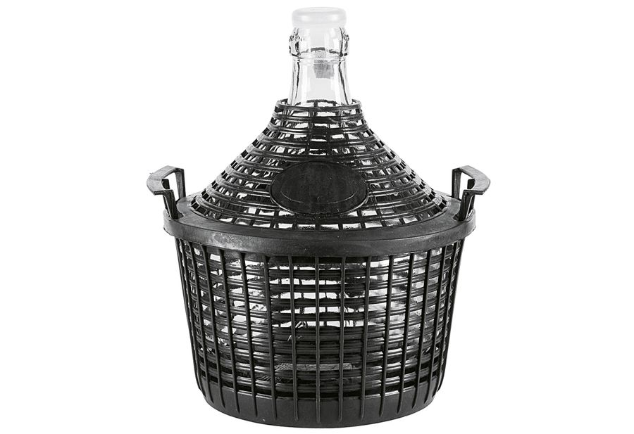 im Kunststoffkorb gefasste Ballonflasche mit Tragegriffen, wird auch als Korbflasche oder Glasballon bezeichnet, optimales Gefäß für Selbstgemachtes, Wein und Spirituosen oder auch für die Aufbewahrung von Saft und Öl·transparent / schwarz 5 l, Ø 20 cm·solange der Vorrat reicht