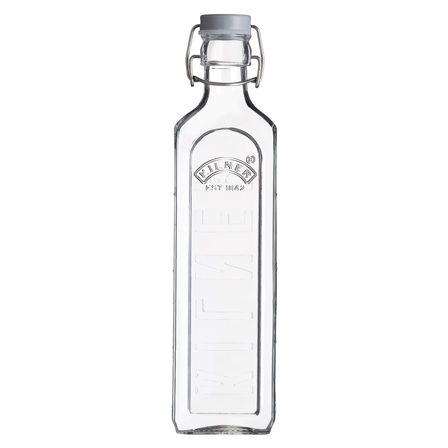 Stilvolle Flasche mit Bügelverschluss im traditionellem und zugleich modernem Styling. Die kräftigen Prägungen des Markennamens und der Kapazitätsanzeigen an den Seiten der quadratischen Bügelverschluss Flasche verleihen dieser einen robustes und prägnantes Aussehen. Perfekt zur Aufbewahrung und Konservierung von Öl, Essig, Sirup und vielem mehr. Die Flasche verfügt über einen grauen Bügelverschluss-Deckel mit Silikondichtung. 1000 ml.