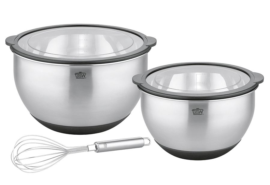 Edelstahl / Kunststoff / Silikon, Inhalt: 1 x Küchenschüssel 4,8 Liter, Ø 24 cm, Höhe 14 cm mit Deckel, 1 x Küchenschüssel 2,8 Liter, Ø 20 cm, Höhe 12 cm mit Deckel, 1 x Schneebesen, luftdicht verschließbar, innenliegende Literskala bis 4,5 l bzw. 2,5 l, Antirutsch-Silikonboden für sicheren Stand, ineinander stapelbar·edelstahl
