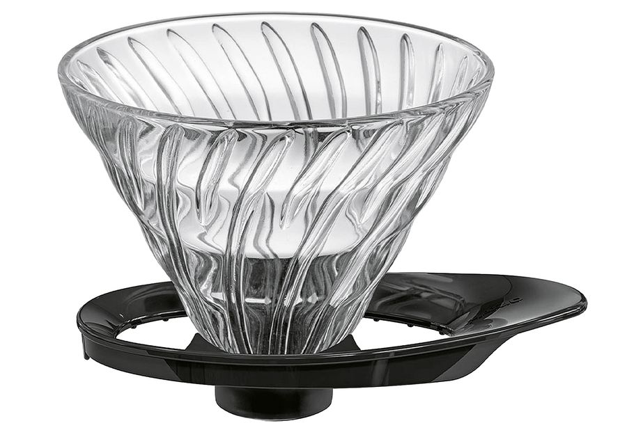 Glas / Kunststoff, für 1 - 4 Tassen, mit konisch zulaufender Bodenöffnung, aufgrund des steileren Neigungswinkels und der größeren Bodenöffnung staut sich der Kaffeefluss nicht, die Innenseite des Filters verfügt über geschwungenen Rillen mit breiten Zwischenräumen, die die Zirkulation des Wassers unterstützen, sodaß der Kaffee immer in Bewegung bleibt und somit gleichmäßig extrahiert wird Ø 12,8 cm, H 9,5 cm