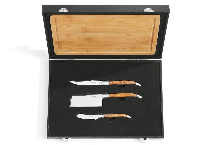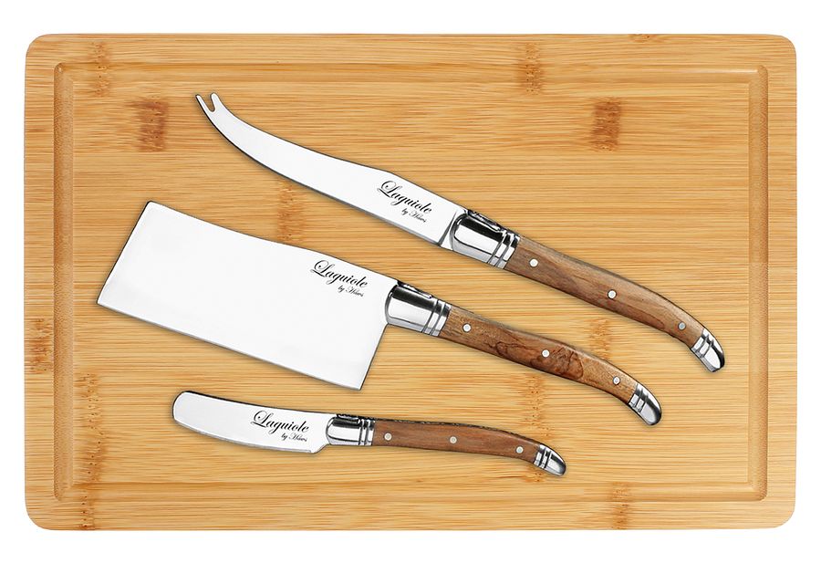 Holz / Stahl, Inhalt: 1 Schneidebrett aus Bambusholz, (LxB): 30x20 cm, 3 Messer aus rostfreiem Stahl mit Olivenholzgriffen, Käsebeil L 23,5 cm, Käsemesser mit Doppelspitze L 26 cm, Weichkäse-/Buttermesser L 14,5 cm, 1 Geschenkbox zum Aufbewahren