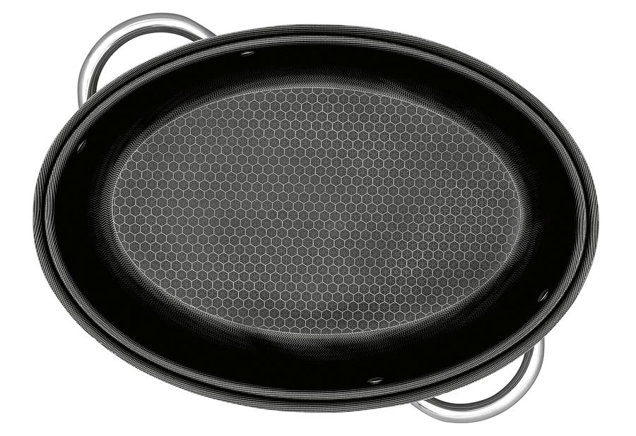 Edelstahl, Wabenstruktur, optimale Hitzeverteilung, Antihaft-Eigenschaft, Deckel aus Edelstahl als Servierpfanne bzw. Auflaufform sowie zum Braten und Kochen verwendbar, wärmeisolierende Edelstahl-Seitengriffe, ofenfest bis 230 °C, für alle Herdarten inkl. Induktion (LxBxH): 41x30x18 cm
