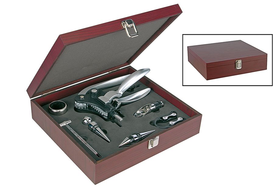 Inhalt: 1 x Korkenzieher (verzinkt), 2 x Flaschenverschluss (verzinkt), 1 x Weinthermometer, 2 x Ersatzkorkenzieher (Metall), 1 x Kragen (Edelstahl), 1 x Eingießhilfe (Edelstahl), 1 x Folienschneider (ABS), 1 x Holzbox (LxBxH): 27x23x6,6 cm