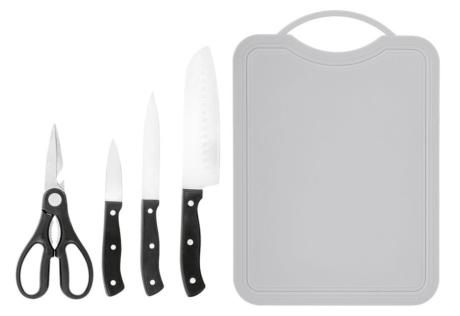 Edelstahl / Kunststoff, Inhalt: 1x Schneidbrett aus Kunststoff, Maße: (LxBxH): 35,7x25,2x0,45 cm und jeweils 1 x Chefmesser L 18 cm, Allzweckmesser L 13 cm, Gemüsemesser L 9 cm, Küchenschere L 20,9 cm